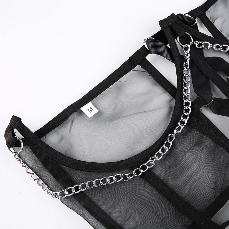 Tauchen Sie ein in die aufregende Welt der urbanen Verführung mit unserem ästhetischen Mesh-Corset. Dieses atemberaubende Top verkörpert die gewagte Street-Fashion.