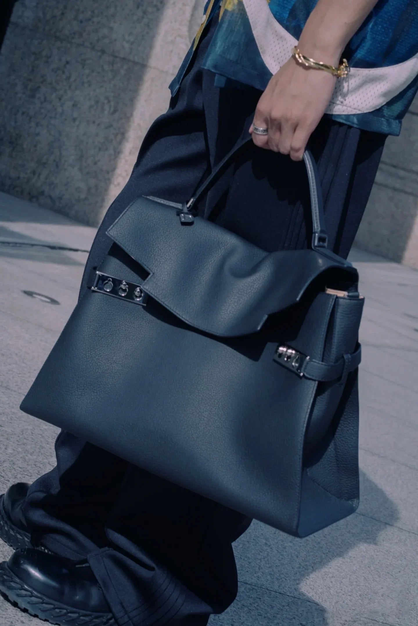 Featuring a secure hasp closure with a signature lock detail, an exterior flap pocket, and an organic cotton-lined interior with smart compartments, it balances style with practicality. Whether for work, travel, or daily use, this versatile satchel fits seamlessly into a modern lifestyle.