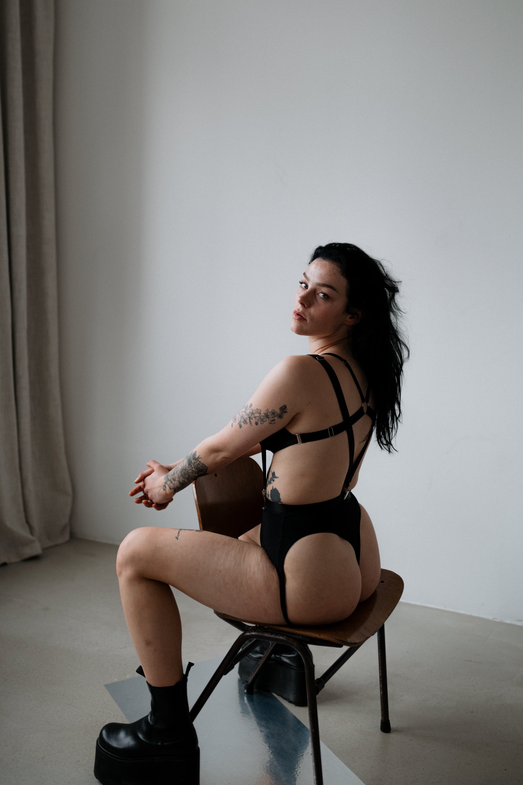 A made of pleasant and flexible black material. Nice to touch, durable elastic bands. Front bra: silver, metal, decorative clasp, cups made of black, elastic material. On the back, there is a decorative composition of elastic bands.