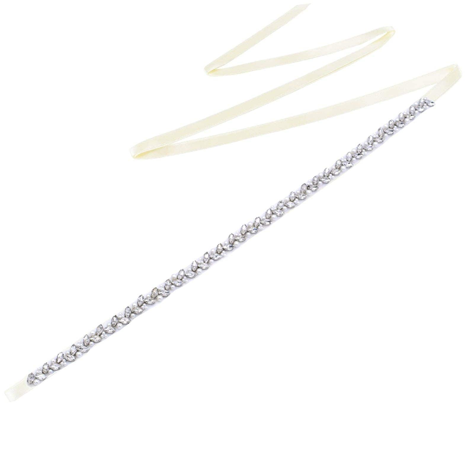 Ein Hauch von Glanz und Eleganz für deinen besonderen Tag: bezaubernder, schmaler Brautgürtel hergestellt aus eingefassten leuchtenden Strasskristallen und hellen Perlenakzenten. Flexibel verstellbar und anpassbar an deine Taille durch ein Band auf der Rückseite.