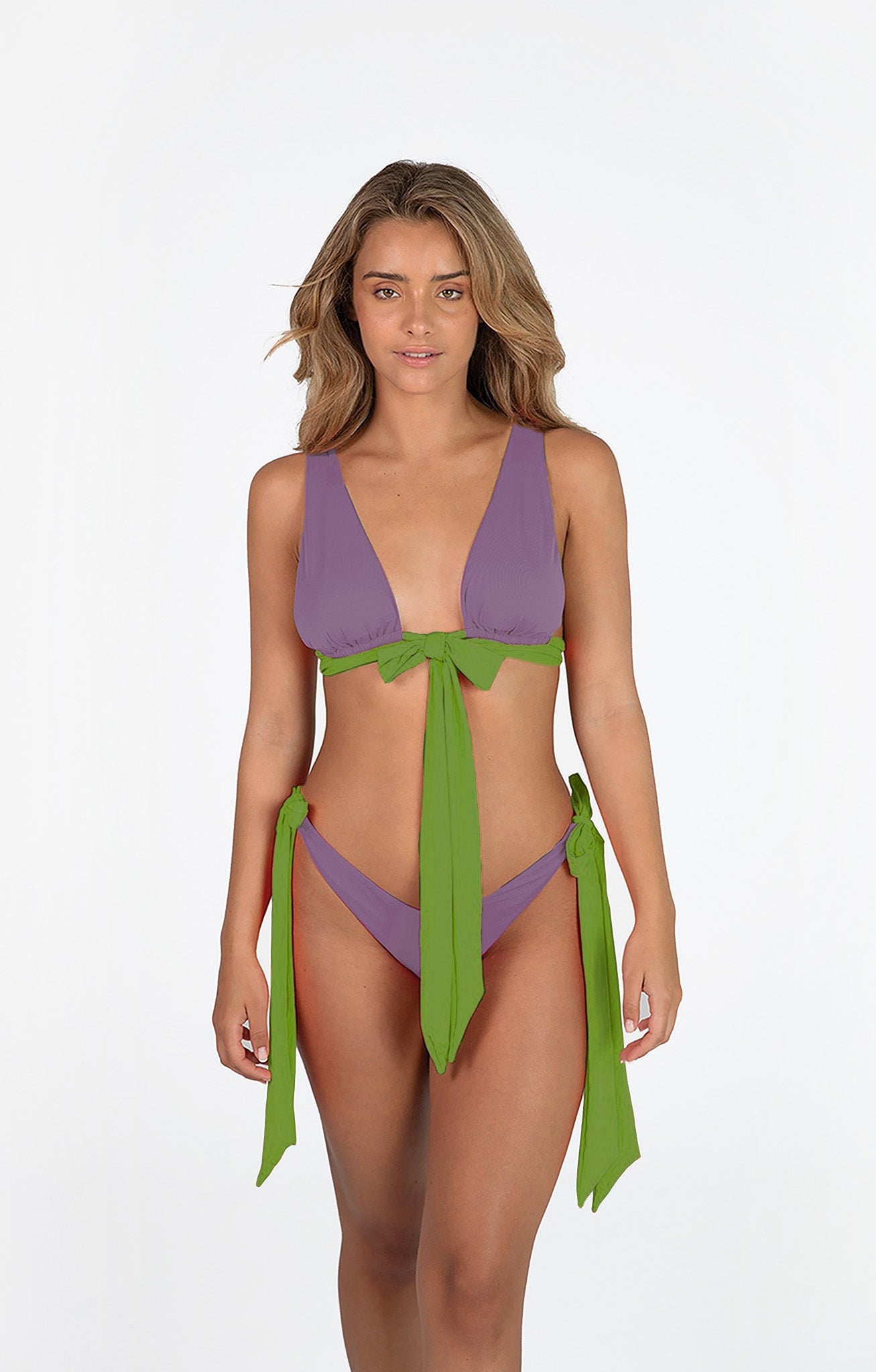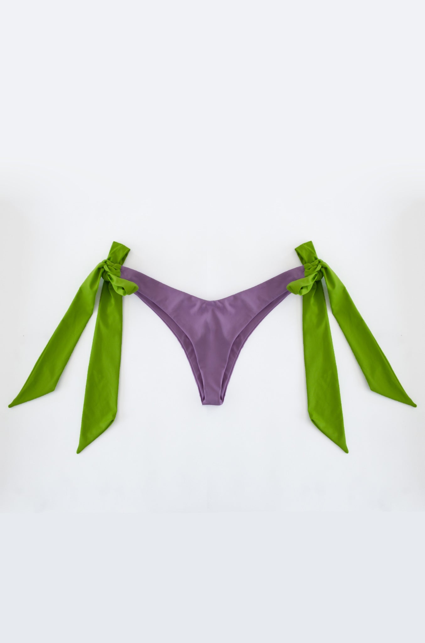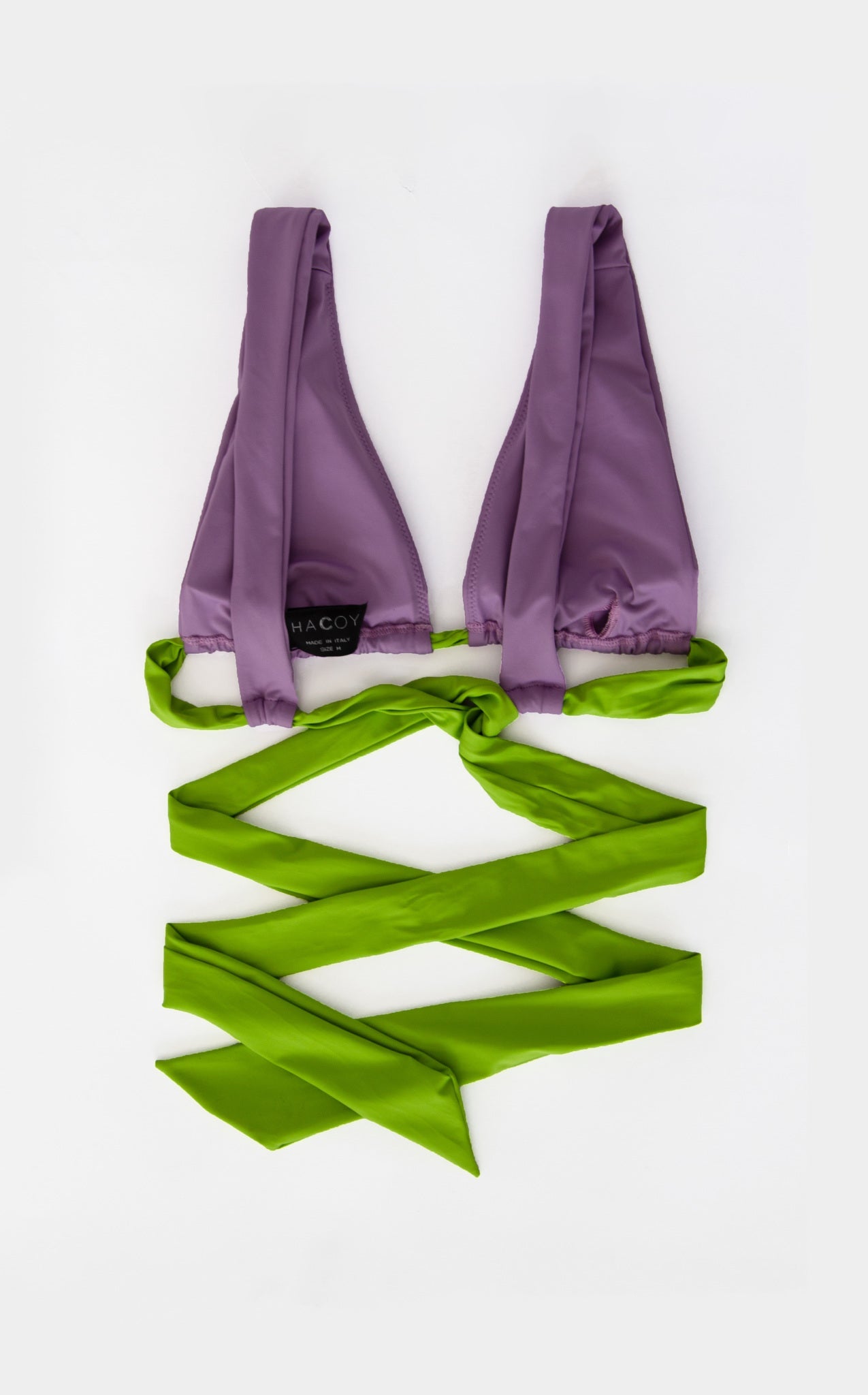 Ready to make a fun and unique statement at the beach in the dual bikini? The high cut bottom is made to enhance the body shape and it comes in two bright colors. It fastens with hardware-tipped ties at the sides and you can adapt it in different ways. The top has a triangle silhouette that fastens the same way as the bottom and features the same colors as the bottom.