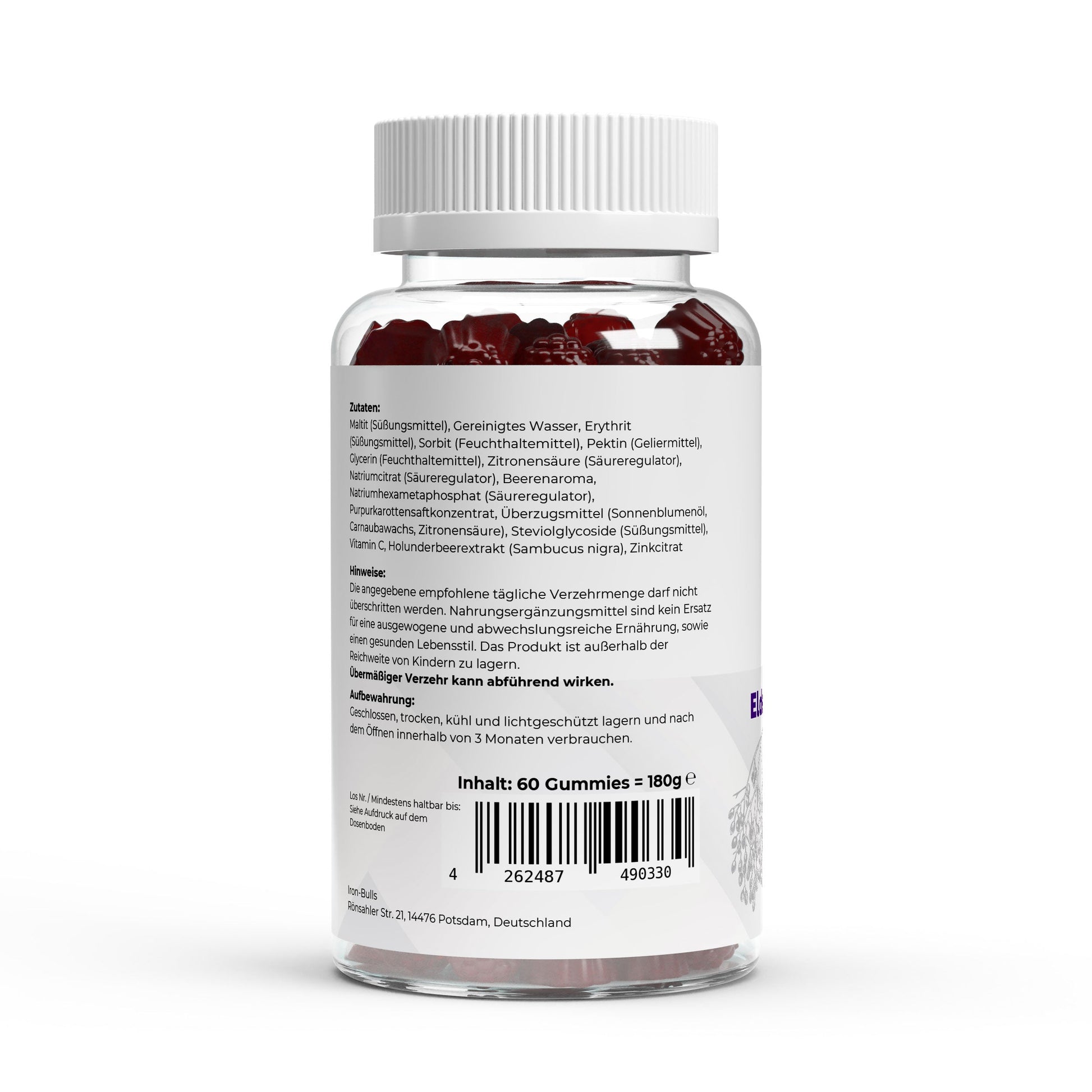 Maltit (Süßungsmittel), Gereinigtes Wasser, Erythrit (Süßungsmittel), Sorbit (Feuchthaltemittel), Pektin (Geliermittel), Glycerin (Feuchthaltemittel), Zitronensäure (Säureregulator), Natriumcitrat (Säureregulator), Beerenaroma, Natriumhexametaphosphat (Säureregulator), Purpurkarottensaftkonzentrat, Überzugsmittel (Sonnenblumenöl, Carnaubawachs, Zitronensäure), Steviolglycoside (Süßungsmittel), Vitamin C, Holunderbeerextrakt (Sambucus nigra), Zinkcitrat.
