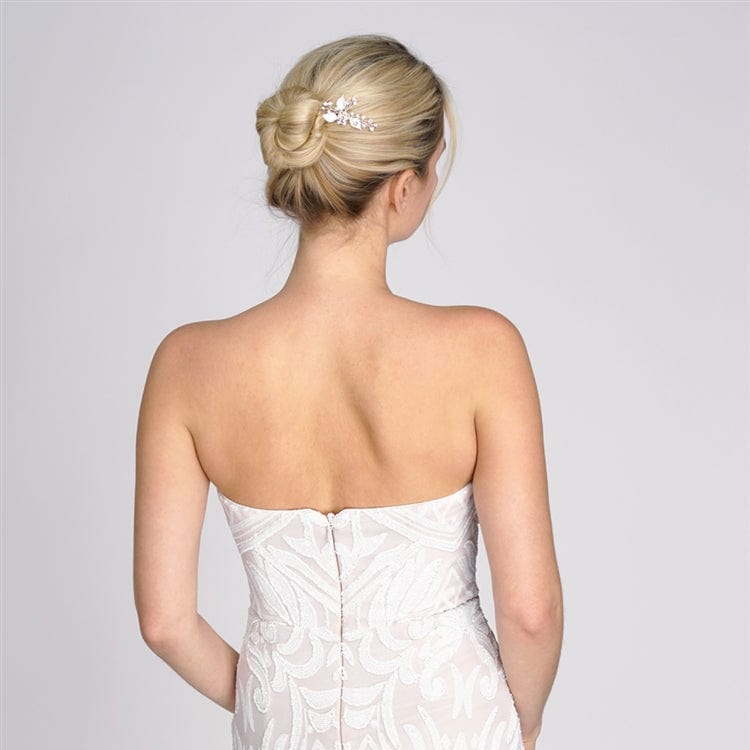 In wervoller Handarbeit hergestellter Brauthaarschmuck mit hochwertigen silbernen oder wahweise goldenen Blättern, Süßwasserperlen und glitzernden Kristallen kreieren unsere silberne bzw. goldene Designer-Brauthaarspange. Mit handgeflochtenen, flexiblen Auslegern.