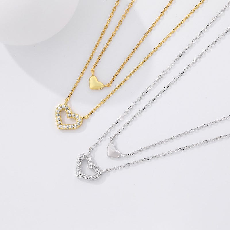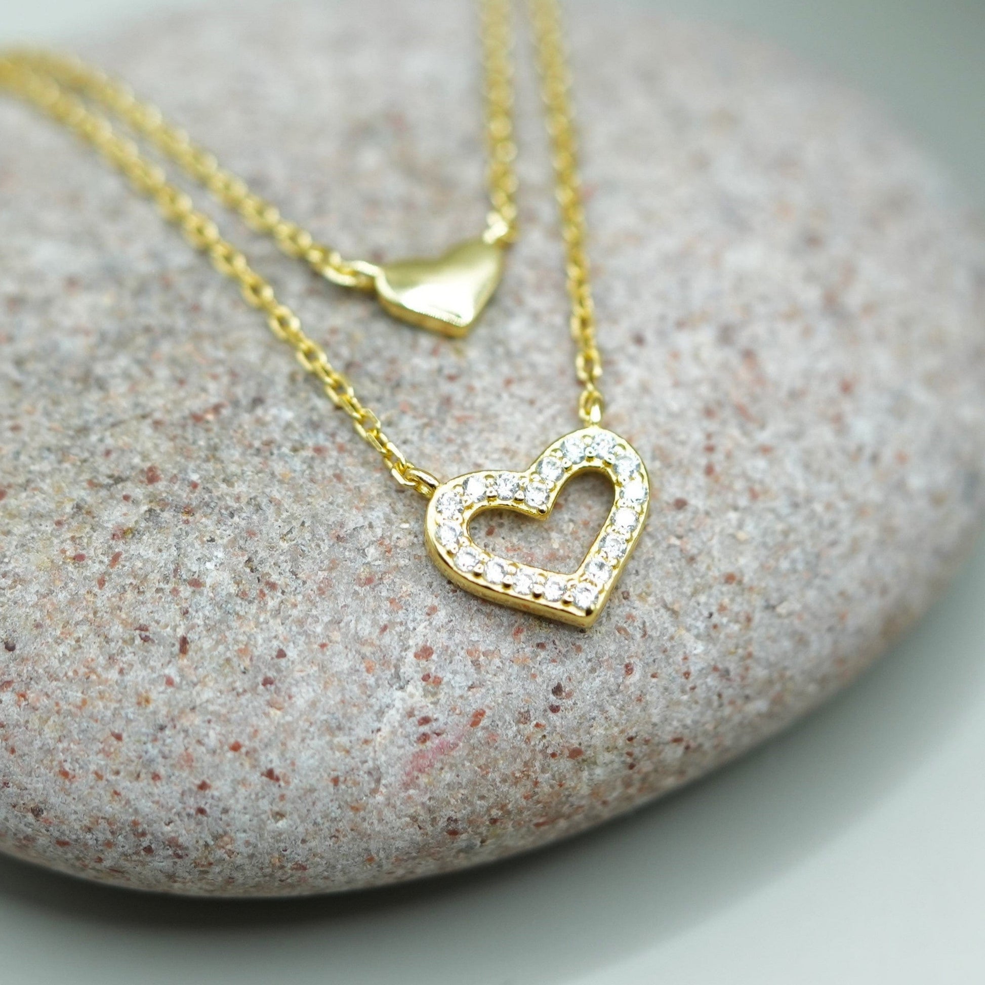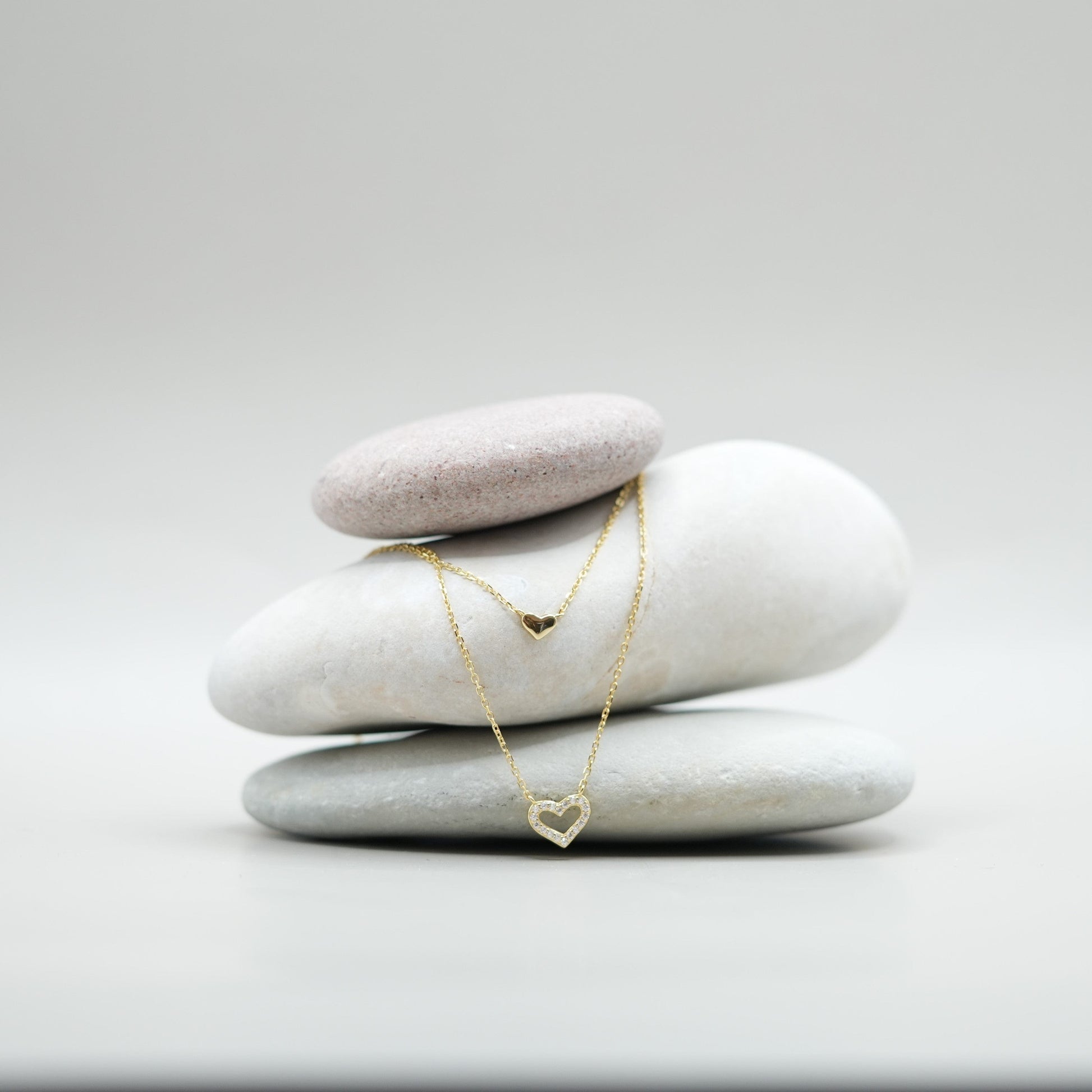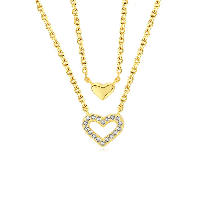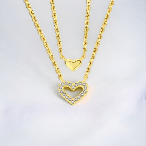 Die Goldkette sorgt für einen zurückhaltenden uns trotzdem einzigartigen Look. Eines der beiden Herz-Anhänger ist mit funkelnden Zirkonia-Steinen verziert.