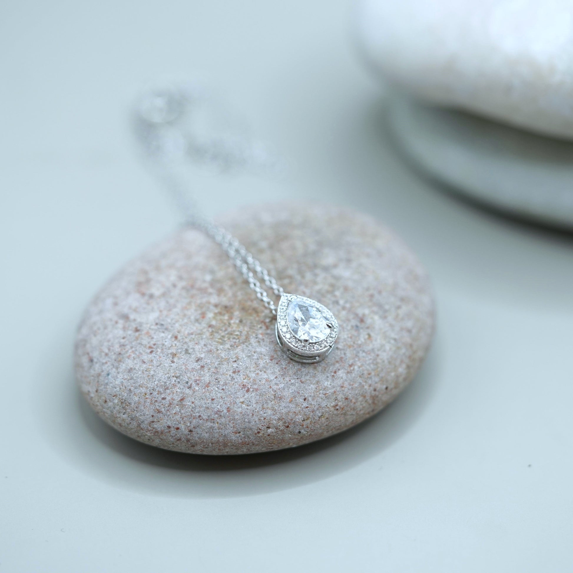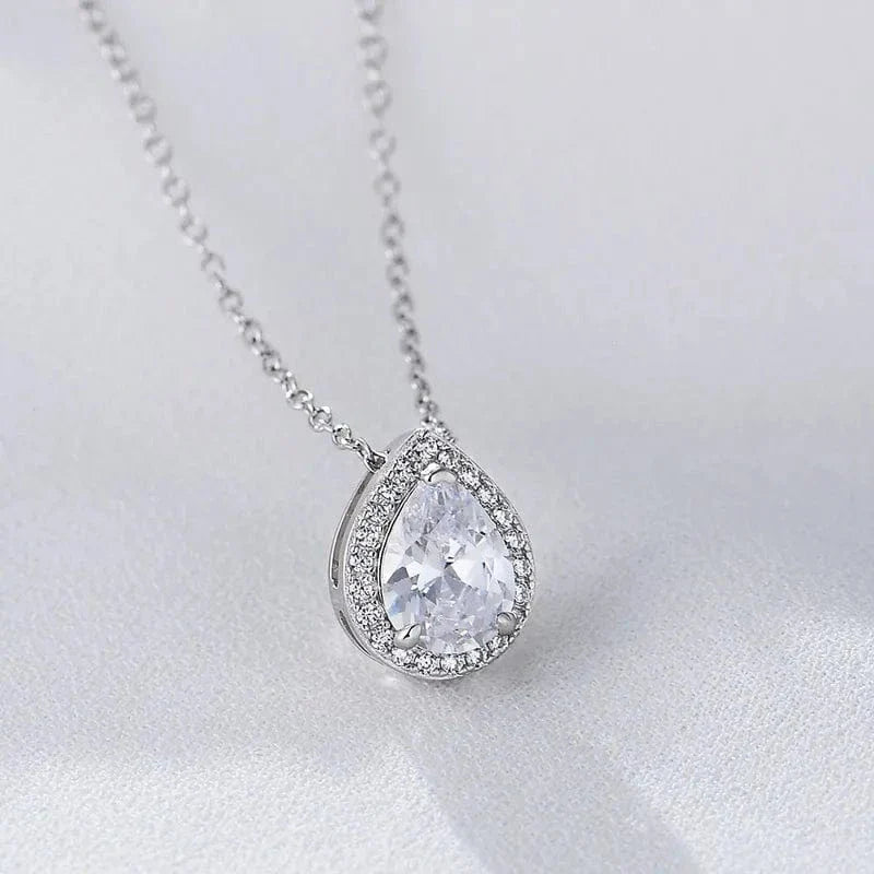 Das Herzstück dieser Halskette ist ein strahlender, tropfenförmiger Anhänger, der mit einem Zirkonia-Stein besetzt ist.