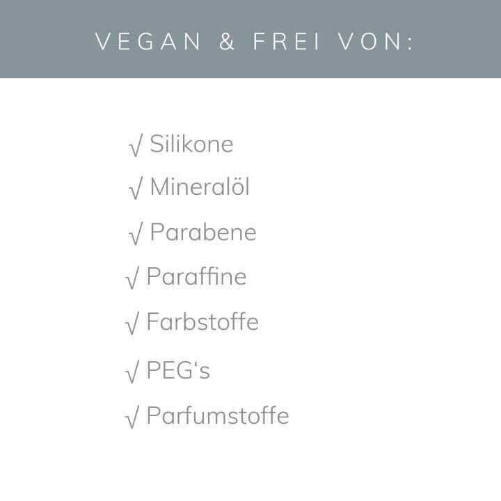 Frei von Silikonen, Mineralöl, Parabenen, Paraffinen, Farbstoffen, PEGs & Parfumstoffen