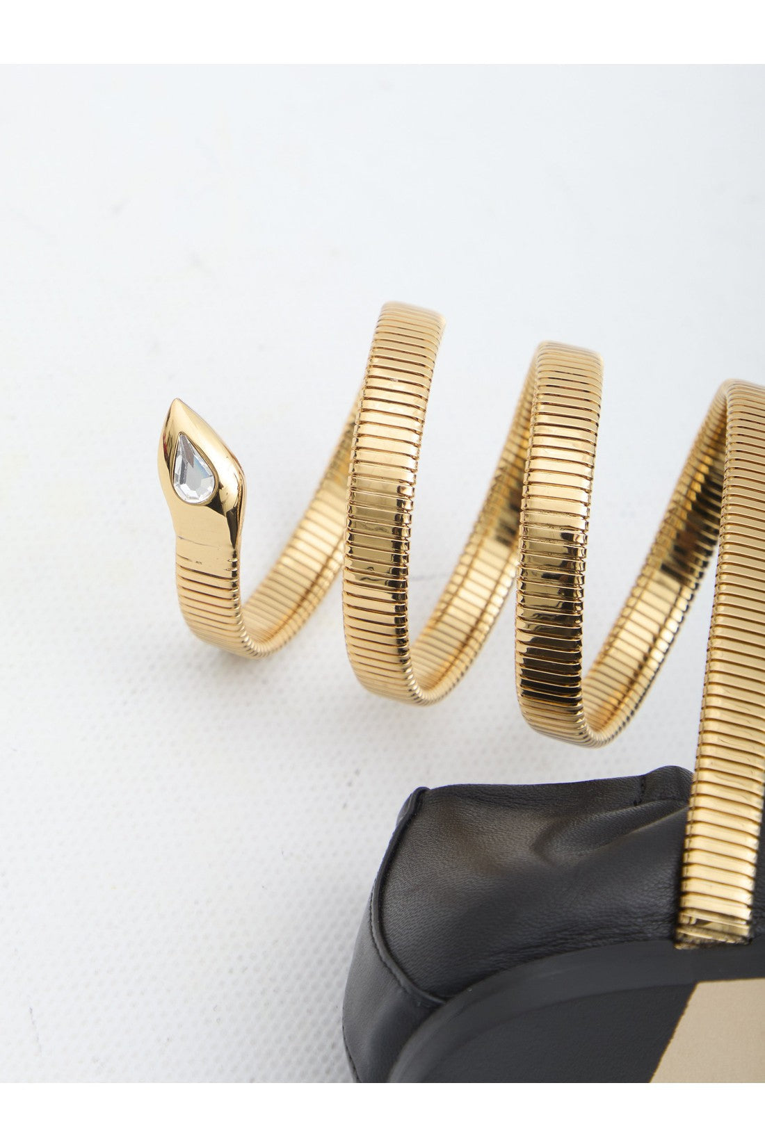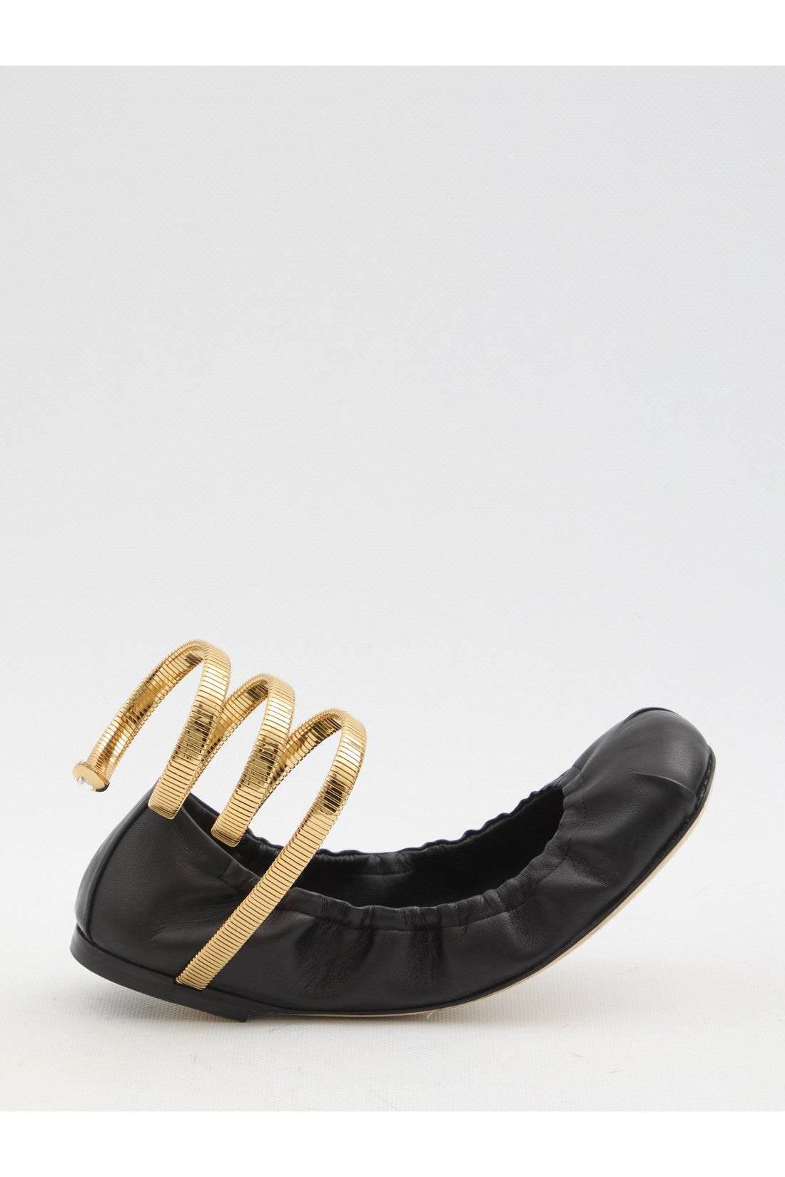 Juniper 10 ballerinas in black lambskin with gold metal mesh serpent. They feature round toe and leather sole. Dust bag included. Any leather imperfections are not to be considered manufacturing defects, but a peculiarity of the material.