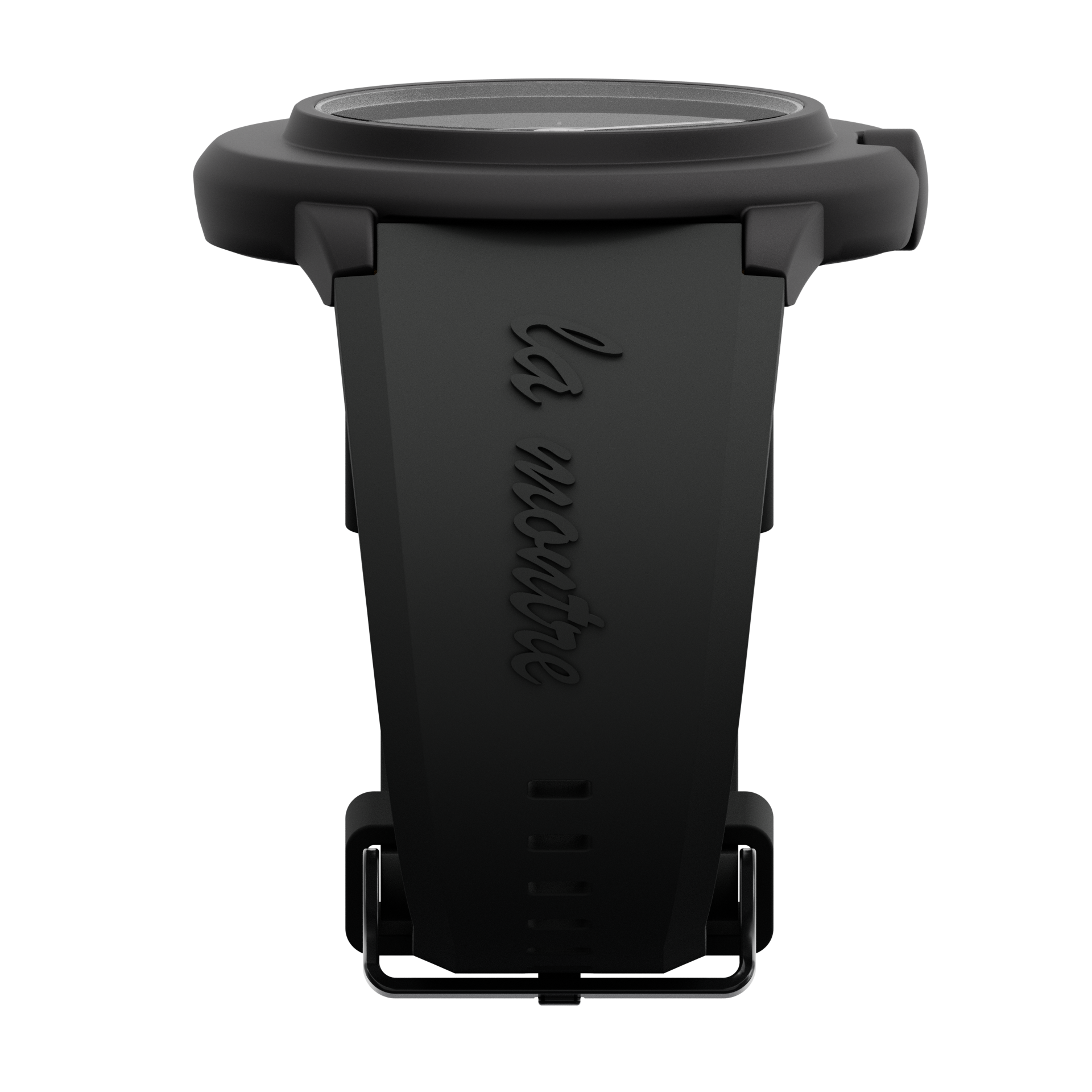 Ein besonderes Highlight ist die Datumsanzeige zwischen 10 und 11 Uhr – eine ungewöhnliche Position, die Blicke auf sich zieht und für Gesprächsstoff sorgt. Dazu harmoniert das rundgebürstete Aluminium-Zifferblatt, das dezente Lichtreflexe erzeugt. Komplettiert wird der Look durch das schwarze Silikonarmband mit erhabener „La Montre“-Prägung und Dornverschluss, das für hohen Tragekomfort sorgt.