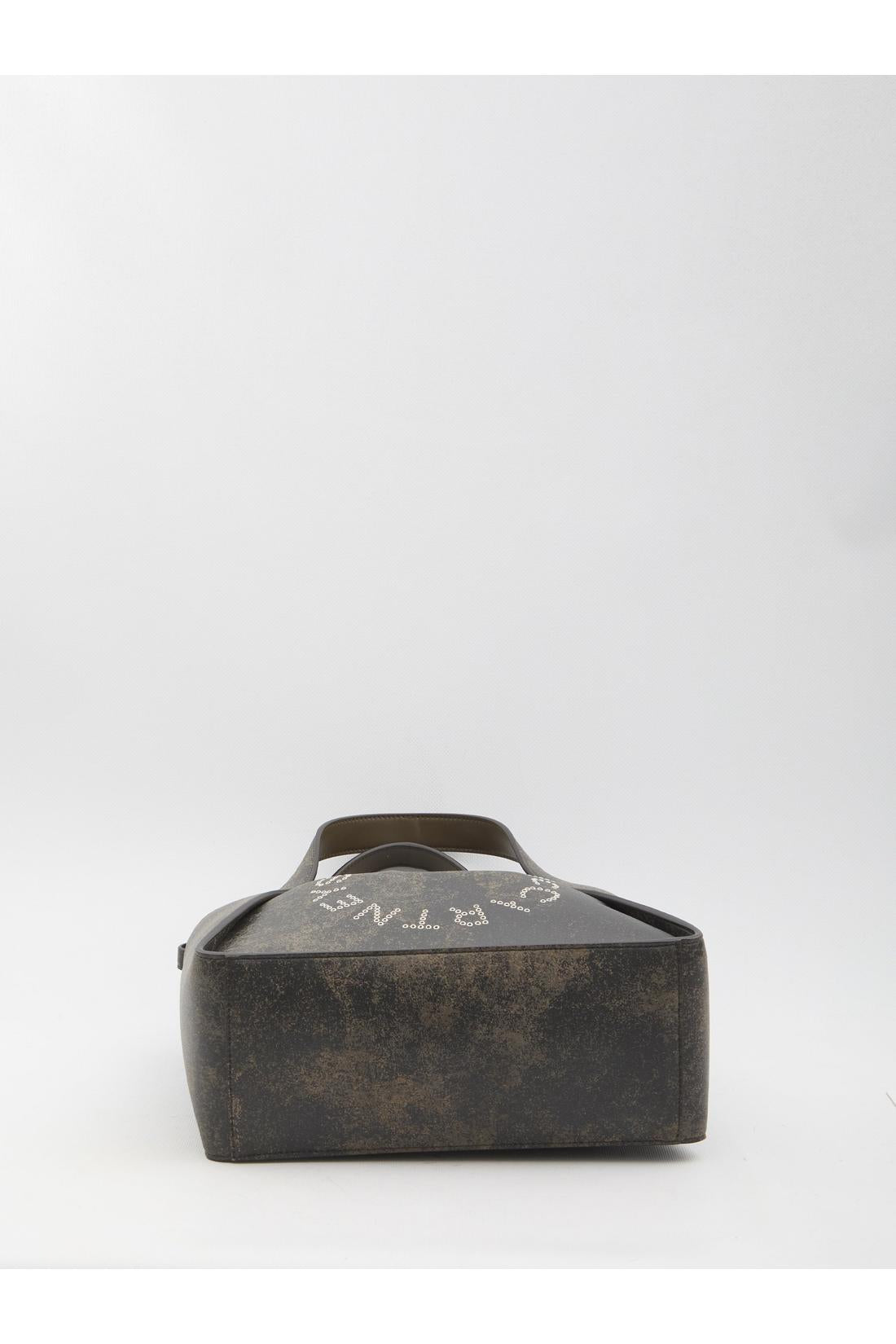 Large Stella Logo bag in "Mud" vintage-effect vegan leather-like fabric, with a perforated Stella McCartney logo with metal eyelets on the front. It features double top handles, an adjustable and removable shoulder strap, tone-on-tone stitching, a snap button closure, one main internal compartment, and a removable internal pouch with a snap button. Dust bag included. Any leather imperfections are not to be considered manufacturing defects, but a peculiarity of the material.
