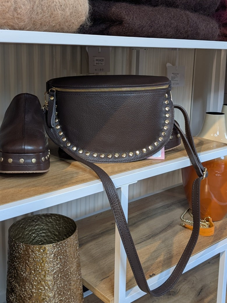 Ledertasche Bauchtasche L Coffee Braun Goldnieten 26x18,5x7cm mit Umhängegurt und RV