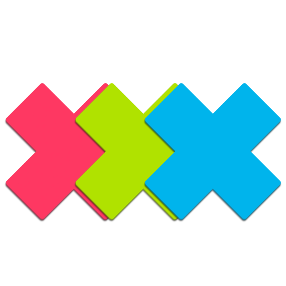 Glow-in-the-Dark Neon Cross Pasties Nipple Covers by Pastease – a bold and edgy accessory that lights up the night! These cross-shaped pasties feature a striking neon pink, blue and yellow color that glows in the dark, making them a standout piece for any occasion. Crafted with attention to detail and comfort in mind, these pasties are both stylish and functional.