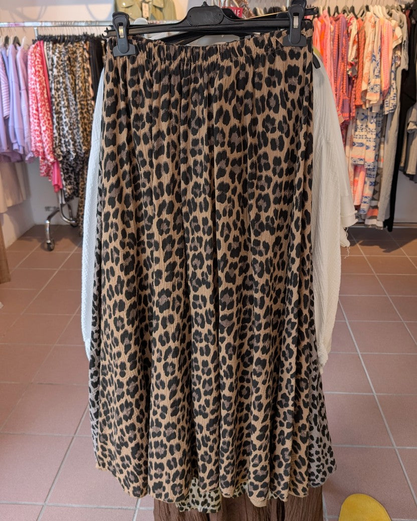 Dieser Rock aus leichtem Mousselin besticht durch sein angesagtes Leo-Muster in Braun und Schwarz. Die fließende Qualität sorgt für angenehmen Tragekomfort und eine feminine Silhouette. Dank der Einheitsgröße passt er sich flexibel an und lässt sich vielseitig kombinieren – perfekt, um Ihrem Outfit einen modischen Akzent zu verleihen.