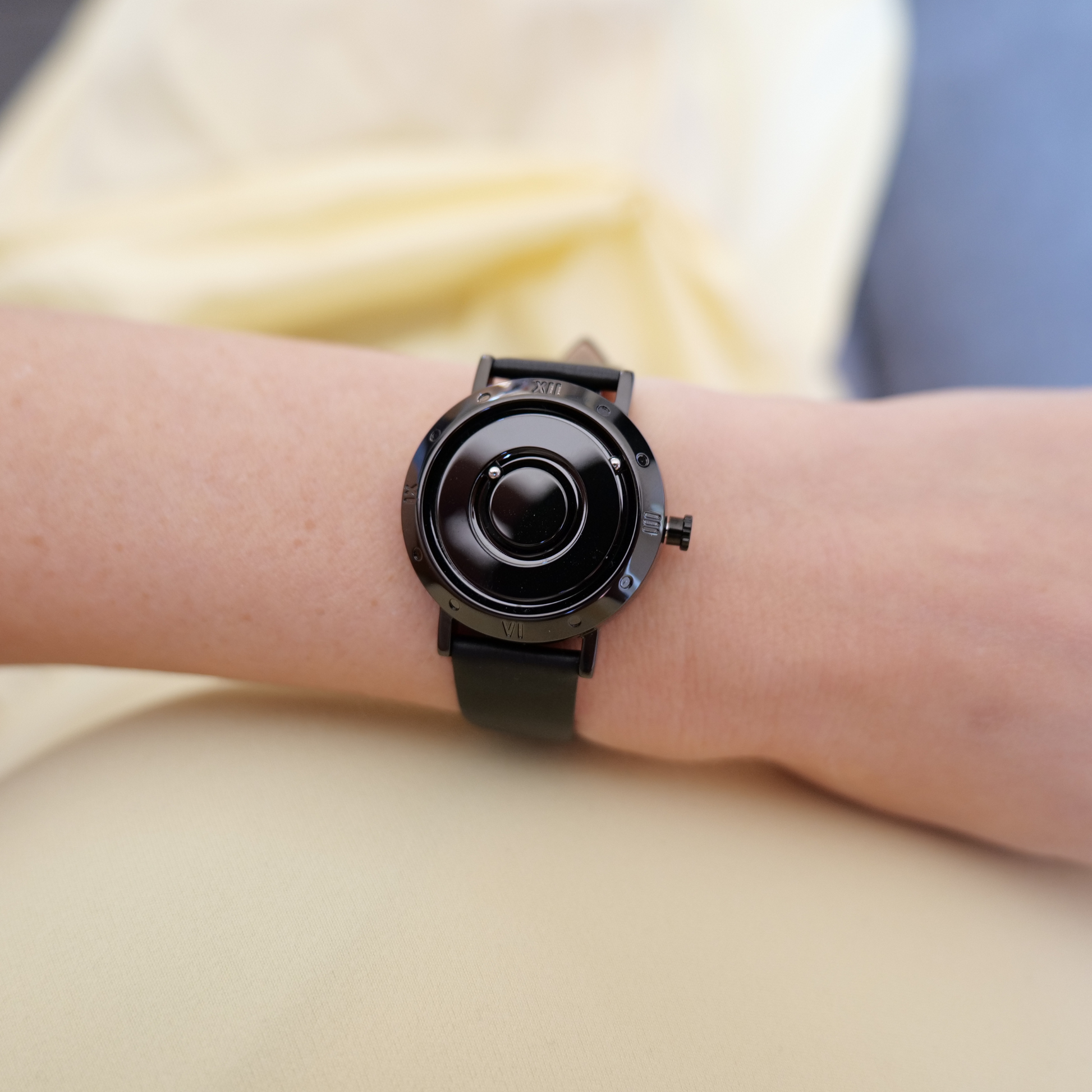 Mit ihrem tiefschwarzen, spiegelnden Zifferblatt verkörpert die Stella Black stilvolle Zurückhaltung und moderne Raffinesse. Das schwarz glänzende Gehäuse aus hochwertiger Alloy unterstreicht den eleganten Look und verleiht der Uhr eine besondere Ausdrucksstärke. Abgerundet wird das Design durch ein passendes schwarzes Satin-Lederarmband, das angenehm weich auf der Haut liegt und sich dezent in jedes Outfit einfügt.