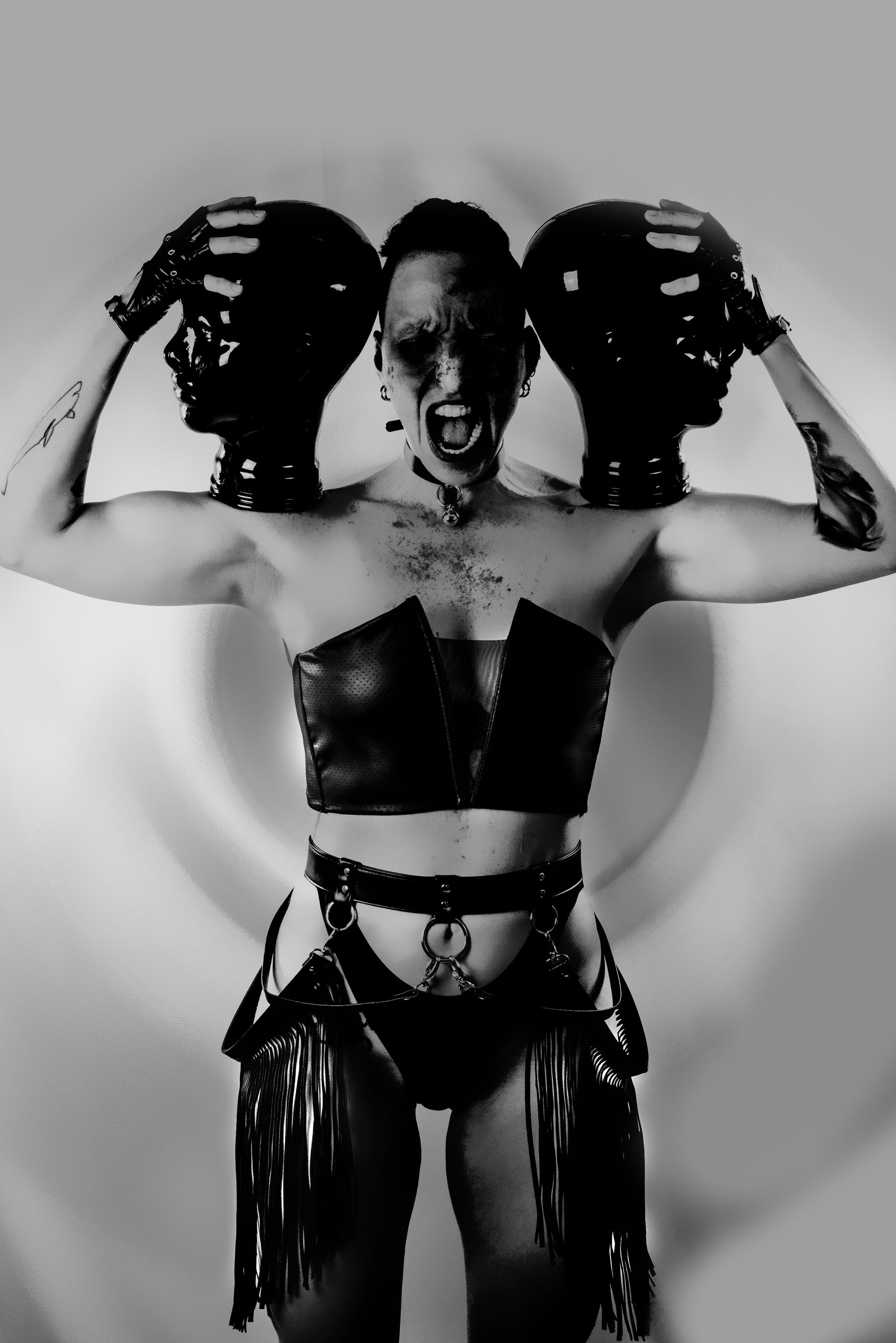 This daring top features a striking triangular black mesh at the front, revealing the cleavage with bold elegance. Crafted entirely from perforated wetlook fabric, it hugs the body for a flawless fit. Hidden underwires and a unique construction ensure the shape stays perfect, while a two-step metal hook fastening at the back offers adjustable comfort. The interior is lined with soft black fabric, making it as pleasant to wear as it is captivating to see.