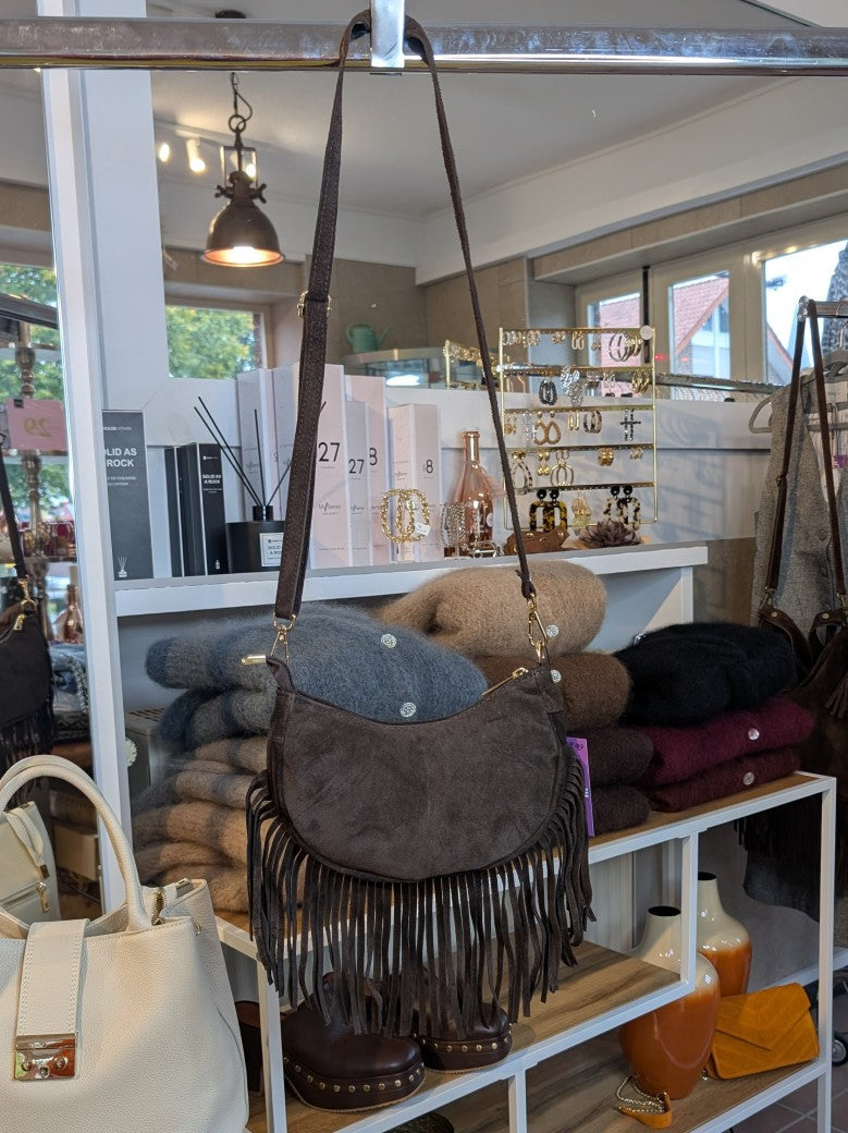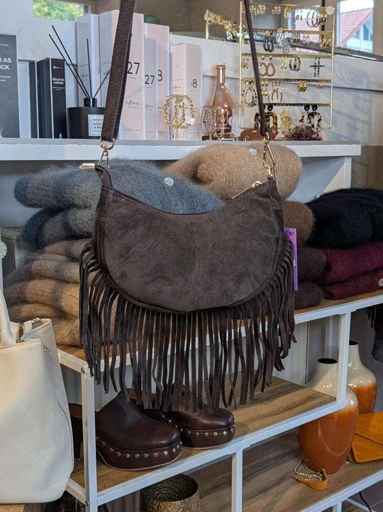 Wildleder Tasche mit Fransen Halbmond M Coffee Braun ca. 22,5cm x 12cm mit Schulterriemen und RV