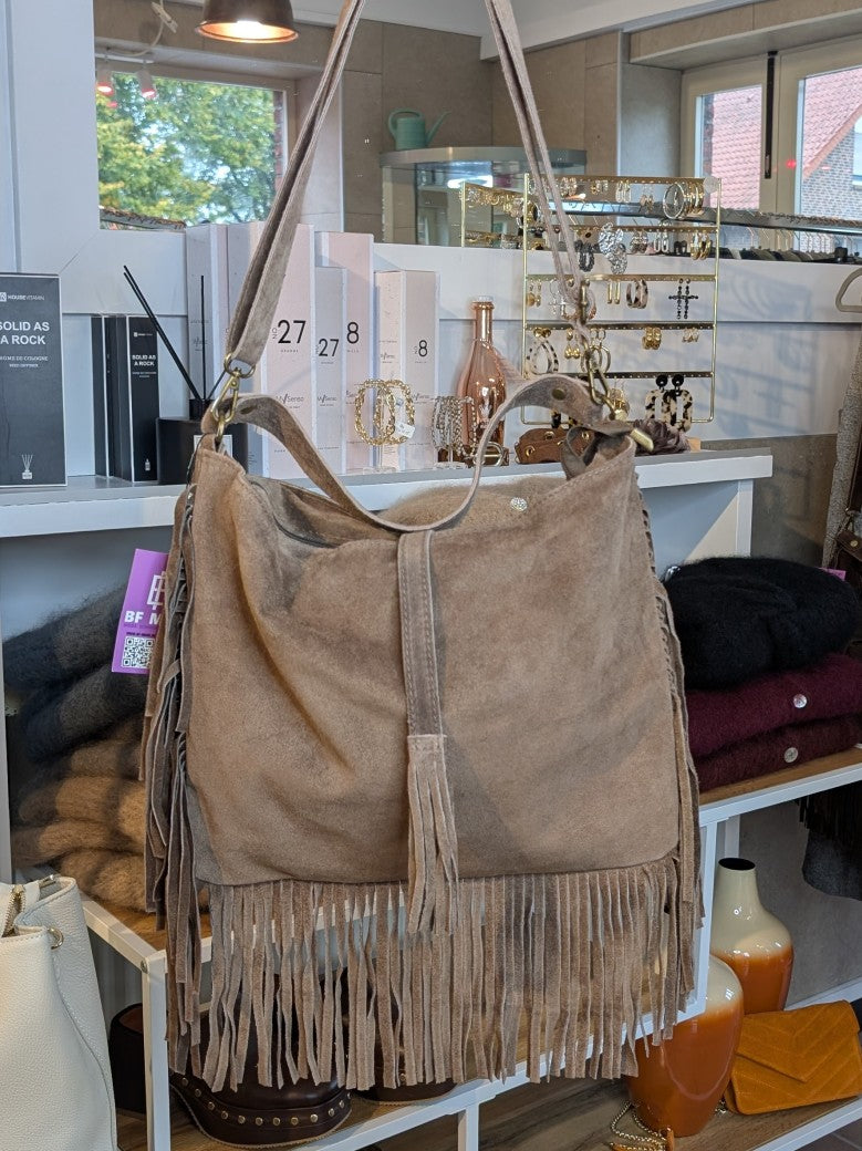 Wildleder Tasche mit Fransen L Taupe ca. 40cm x 29cm mit Schulterriemen und RV
