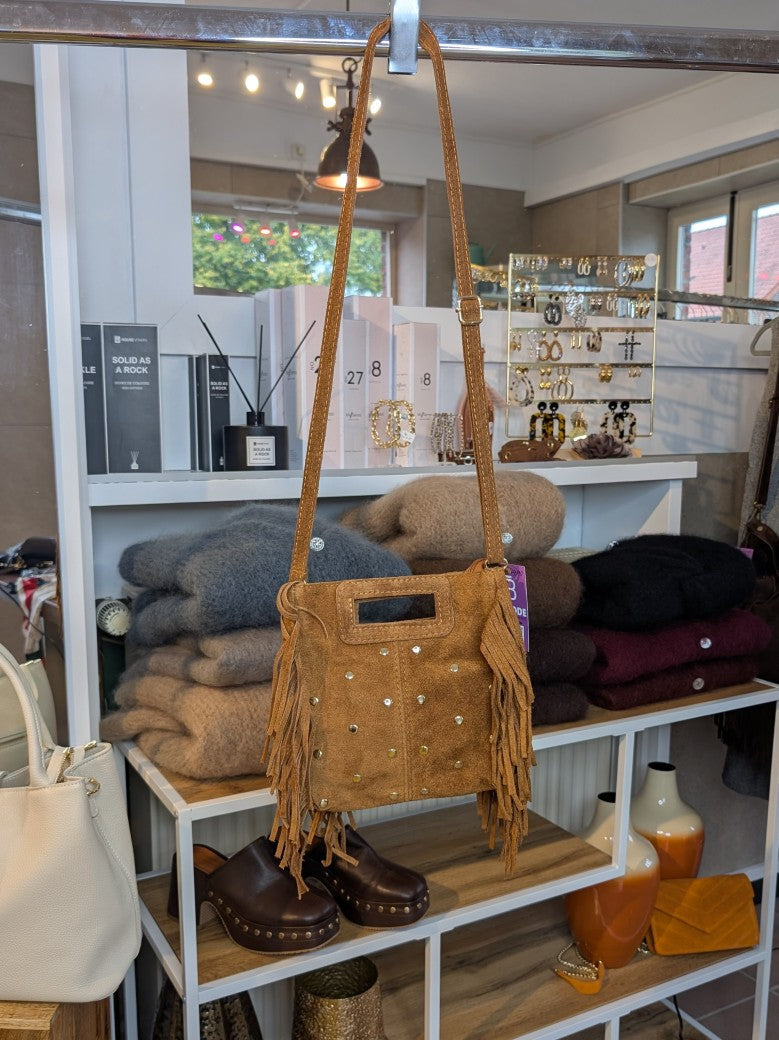 Wildleder Tasche mit Fransen und Nieten Gold M Cognac ca. 19cm B x 22,5cm H, Schulterriemen und RV